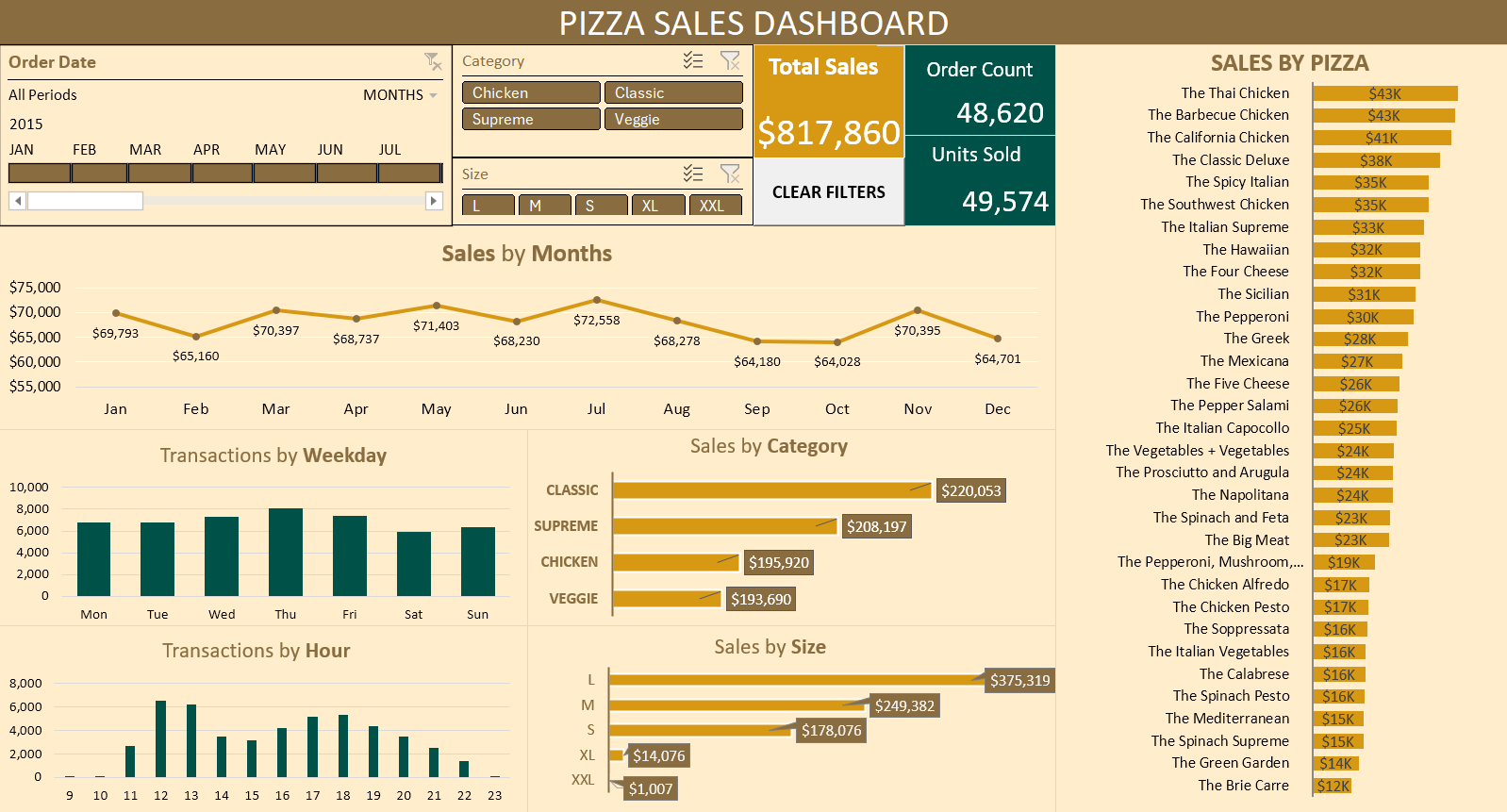 For the purpose of preparing for the next year, a fictional pizza shop has gathered all of the data regarding their sales over the course of a year and needs a report that summarizes every aspect of their operation. This can be accomplished by creating an interactive dashboard that allows users to see trends, spot patterns, and make wise business decisions. Excel will the tool of choice, along with all of its features, including Power Query, Pivot Table, and PivotChart.